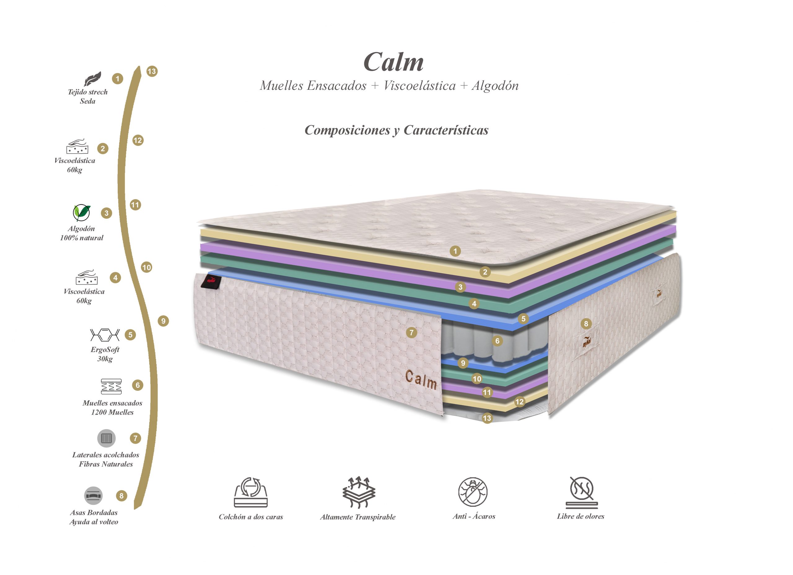 - Viscoelástica: 2 cm. de viscoelástica de 50kg/m³ que se adapta al cuerpo, minimizando la presión evitando movimientos innecesarios y mejorando las horas de sueño.