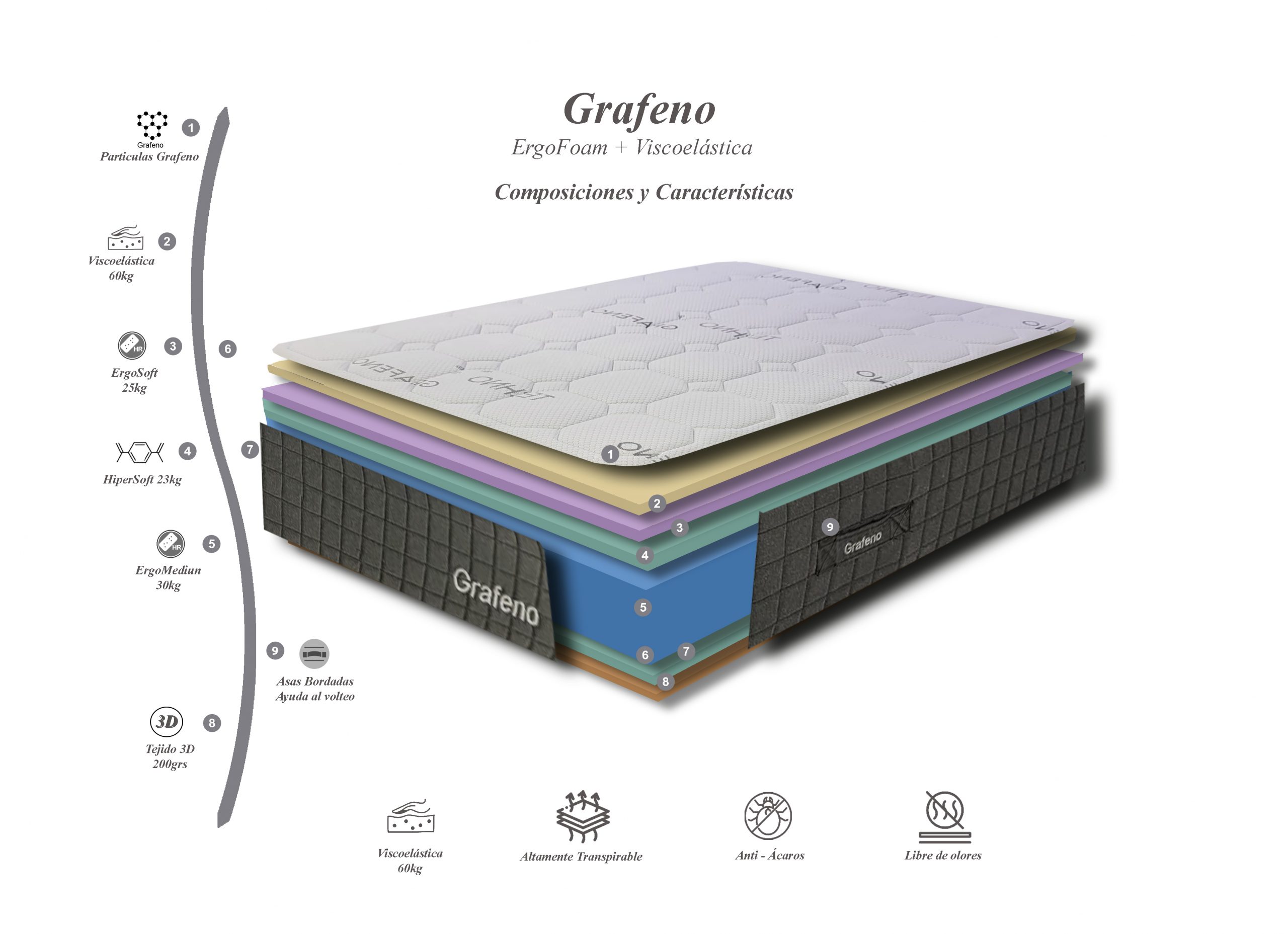 El colchón Grafeno combina Grafeno y acolchado hipoalergénico de alta calidad , evitando la acumulación de temperatura y maximizando el confort.