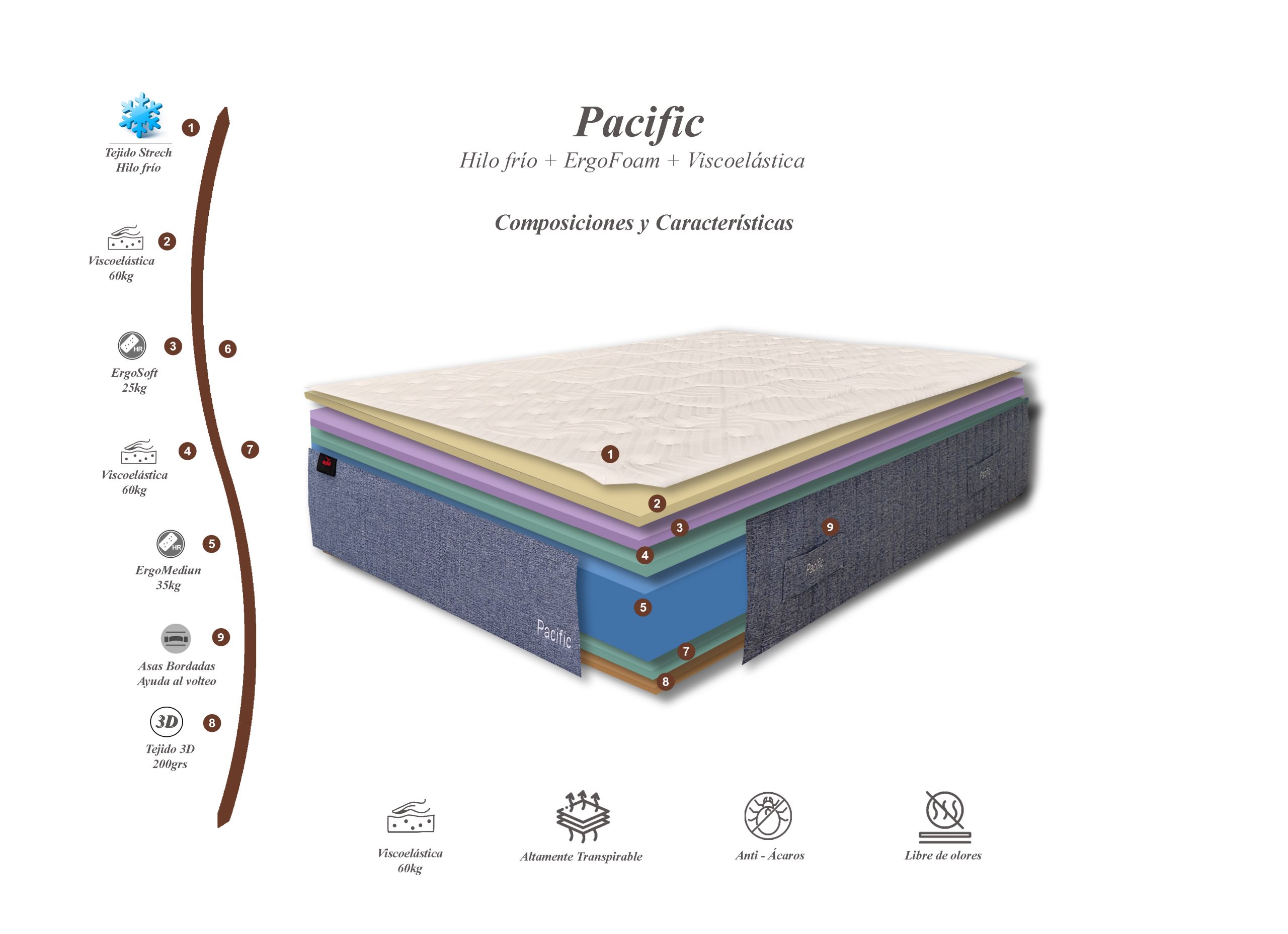La incorporación de tejido con hilo frío (tecnología cool) proporciona una sensación de frescor constante. Este material ayuda a disipar el calor corporal y a mantener una temperatura estable, ideal para personas calurosas o para climas templados y cálidos.