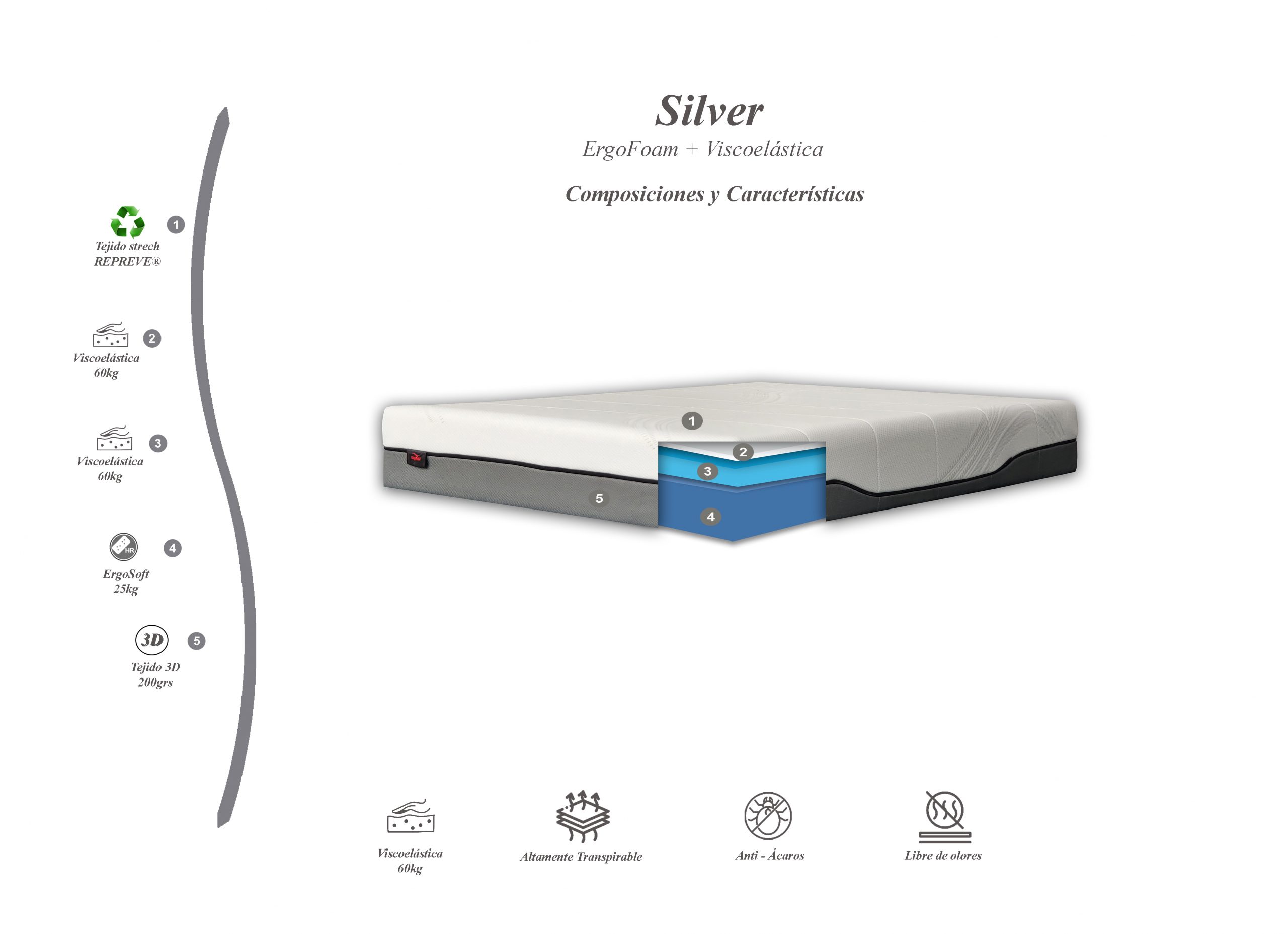 Silver es un colchón viscoelástico compuesto por un núcleo altamente adaptable de Ergofoam HR, con una buena firmeza, pero a la vez una alta adaptabilidad que permite usarlo en camas articuladas (alturas 18cm y 22cm).