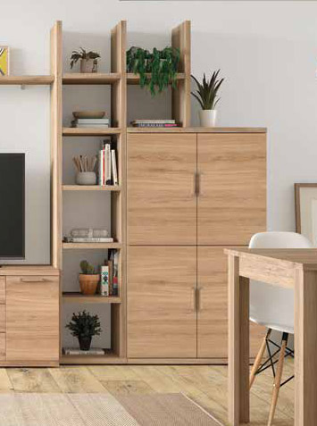 La composición de salón Kronos 717 se compone de una estanterĆa, una vitrina alta, un estante, un módulo de televisión. Un diseƱo sencillo, funcional y moderno. Los módulos estĆ”n fabricados en melamina de primera calidad y disponibles a escoger entre acabados: Artisan, Roble natural y Polar.