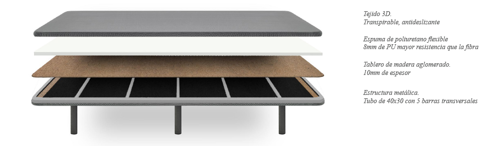 Base tapizada con tejido transpirable 3D , esta indicado para todo tipo de colchones viscoelásticos , muelles ensacados  o látex manteniendo la firmeza del colchón y alargando la vida útil del colchón a la vez que mejorando el descanso. Gran resistencia gracias a sus barras centrales de refuerzo y tubo de acero.Â