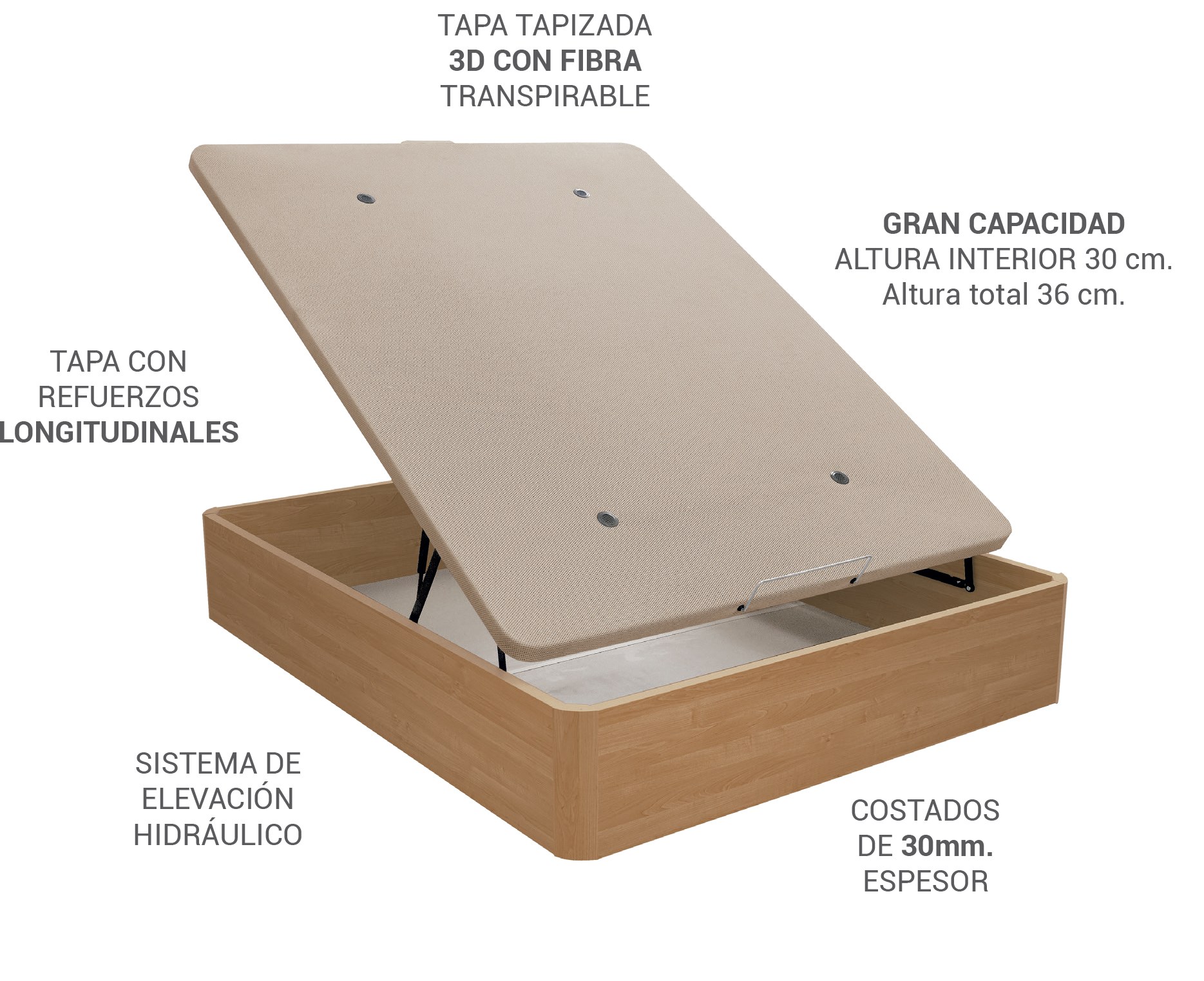 Su tapa tapizada con tejido de 3D, es el soporte ideal para el colchón garantizándote el mejor descanso.